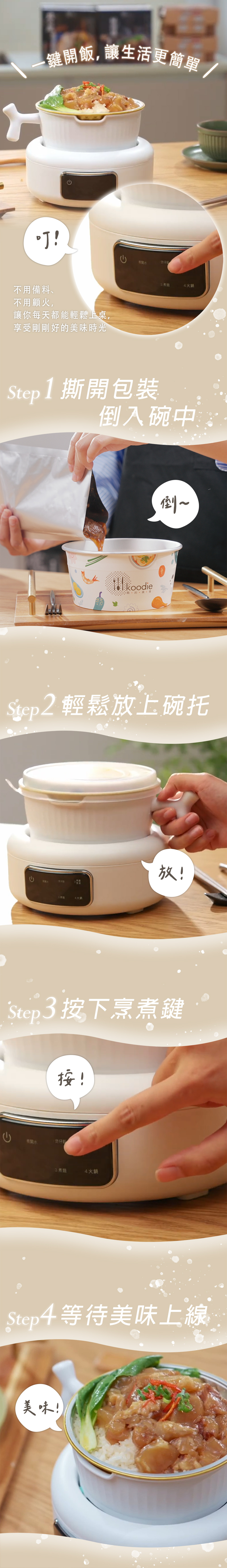 koodie智烹機,讓一切得變簡單,不用備料、不用顧火,多款餐點選擇,只要按下按鍵,結合智能與美味的餐點就能快速上桌!
